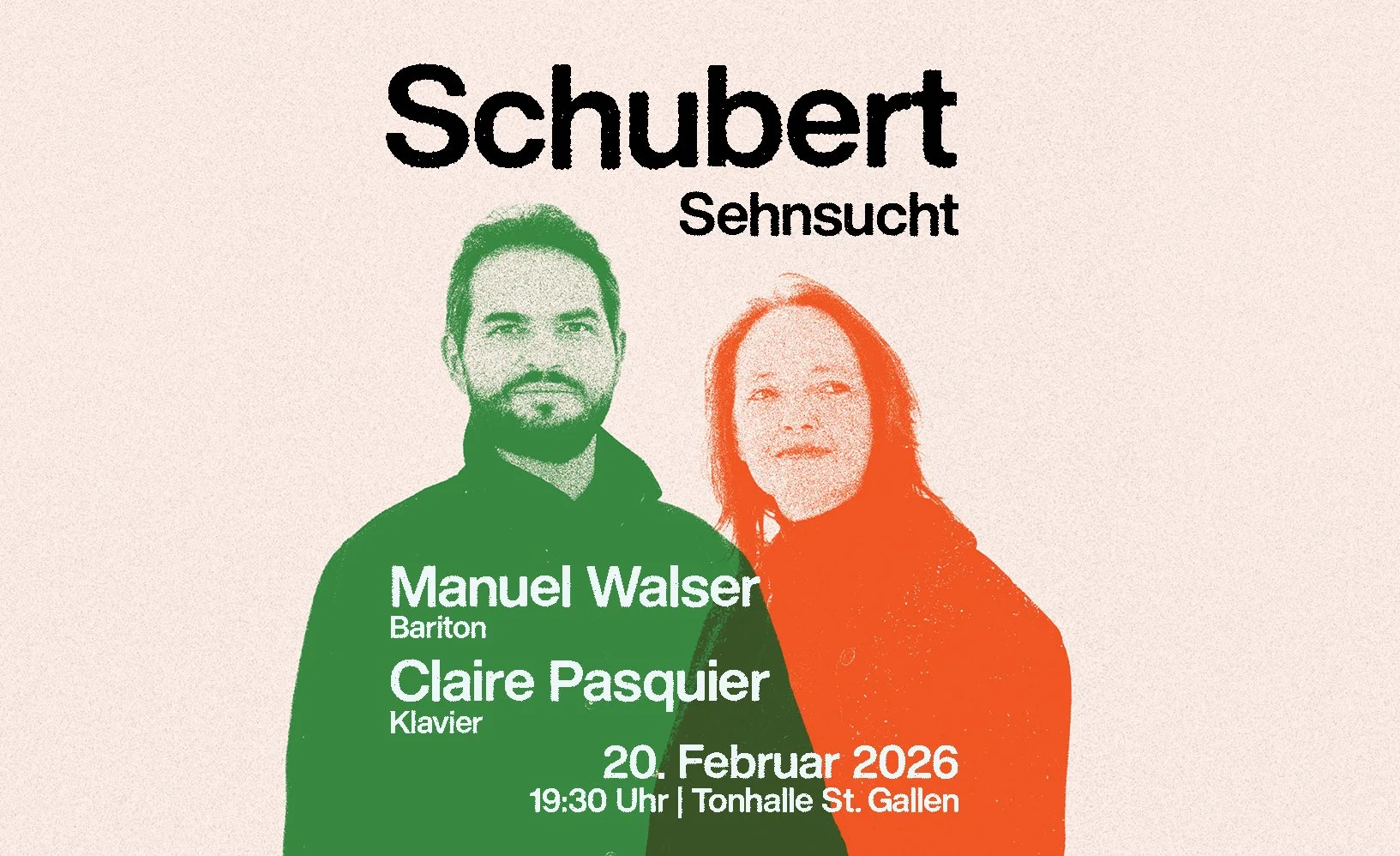 St. Gallen Friday, February 20, 2026 7:30 PM 9:00 PM 19:30 21:00 Tonhalle St. Gallen Museumstrasse 25 St. Gallen, SG, 9000 Schweiz (map) Google Calendar ICS ProgrammFranz Schubert: SehnsuchtBesetzungManuel Walser - BaritonClaire Pasquier - Klavier Tickets Mehr Informationen